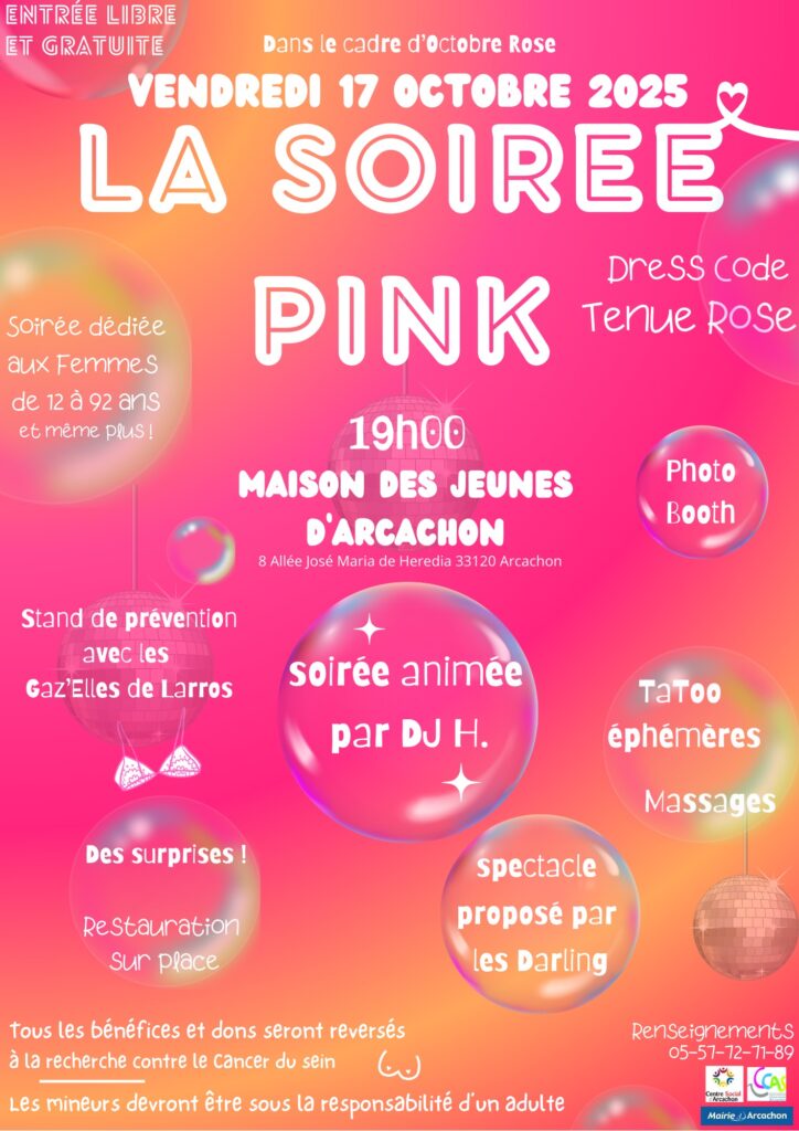 🎀 Dans le cadre d’octobre rose, le Centre Social, le Centre Communal d’Action Sociale et la Maison Municipale des Jeunes organisent la soirée pink le vendredi 17 octobre, dès 19h.
